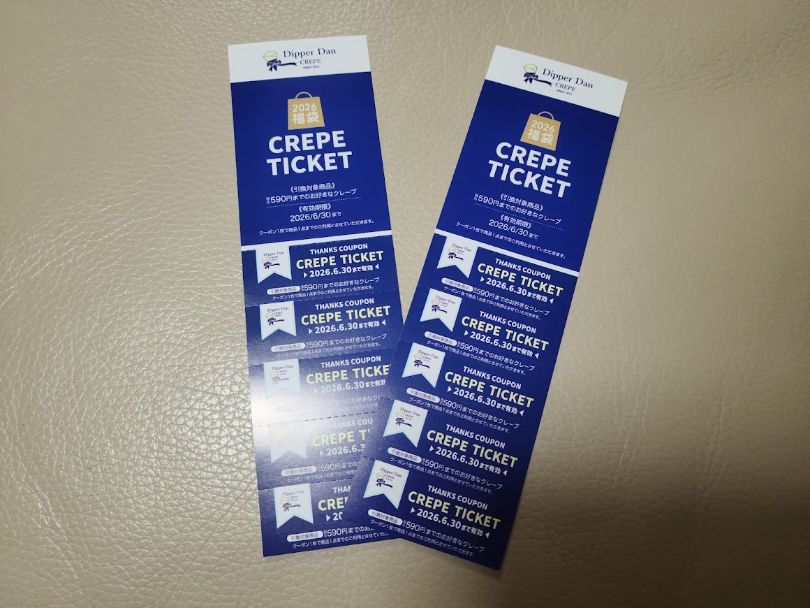 たまにはクレープもいいかなと思うときがあるので、ディッパーダンの福袋を購入しました。クレープチケット5枚綴りが2000円で2セット。590円までのクレープをいただけるのでなかなかお得な福袋ですね^^